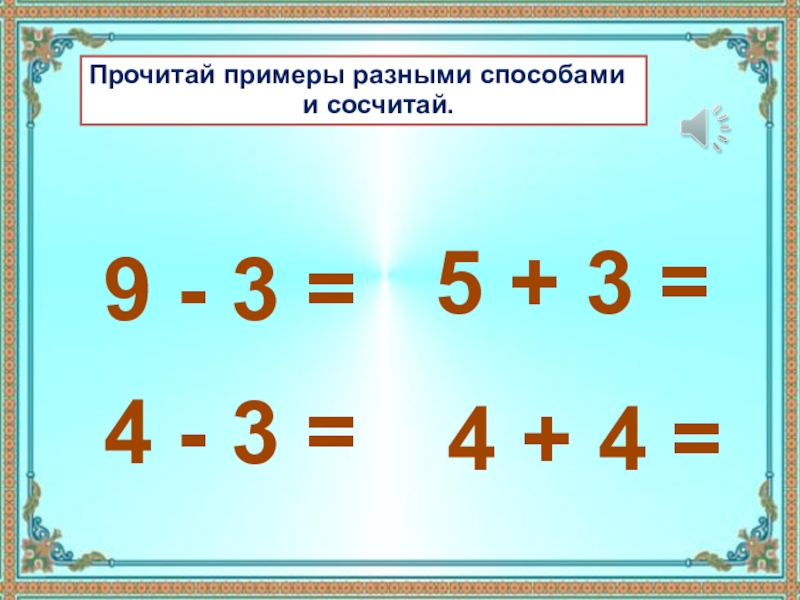 9 - 3 =4 - 3 =5 + 3 =4 + 4 =Прочитай примеры разными способами и сосчитай.
