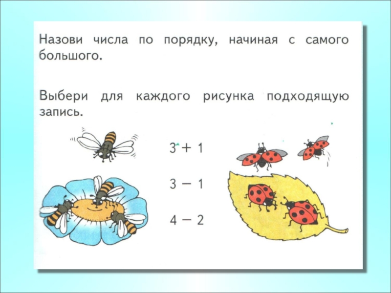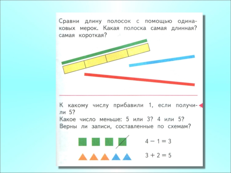 Запиши в тетрадь примеры. Реши их.4 - 3 =5 - 1 =3 + 2 =4 + 1