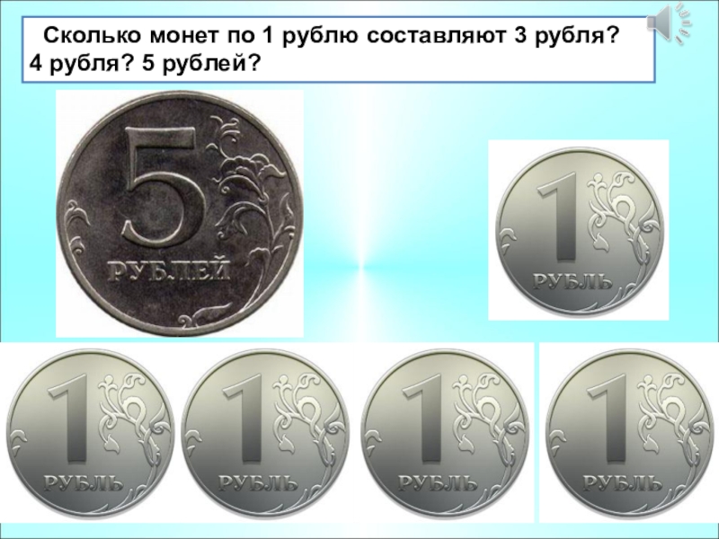 Сколько монет по 1 рублю составляют 3 рубля? 4 рубля? 5 рублей?