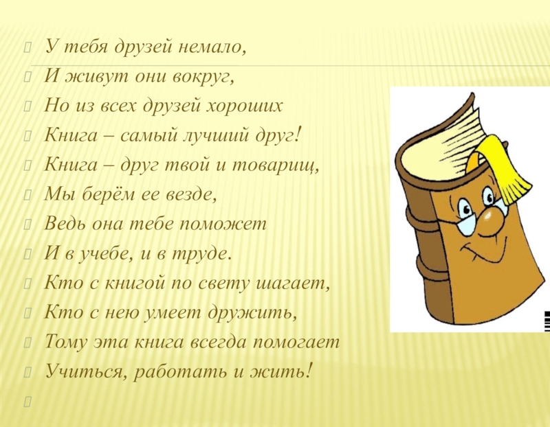 У тебя друзей немало,И живут они вокруг,Но из всех друзей хорошихКнига – самый лучший друг!Книга – друг