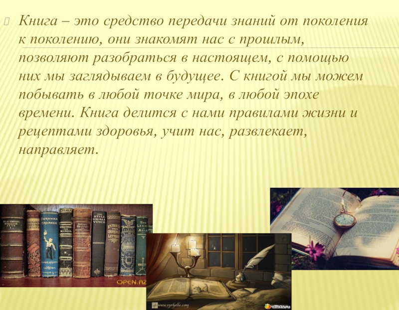 Книга – это средство передачи знаний от поколения к поколению, они знакомят нас с прошлым, позволяют разобраться