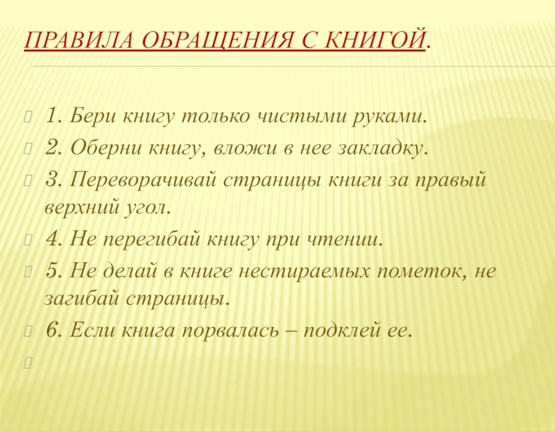 Правила обращения с книгой.   1. Бери книгу только чистыми руками.2. Оберни книгу, вложи в нее закладку.3.