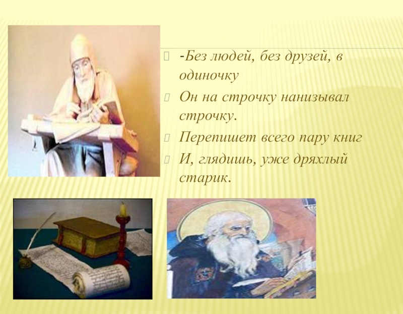 -Без людей, без друзей, в одиночкуОн на строчку нанизывал строчку.Перепишет всего пару книгИ, глядишь, уже дряхлый старик.