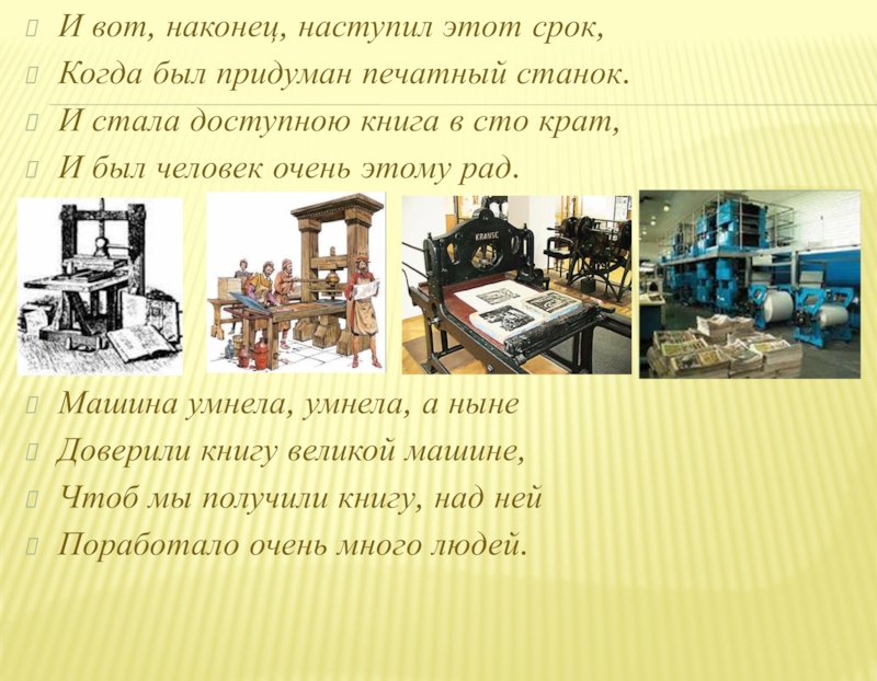 И вот, наконец, наступил этот срок,Когда был придуман печатный станок.И стала доступною книга в сто крат,И был