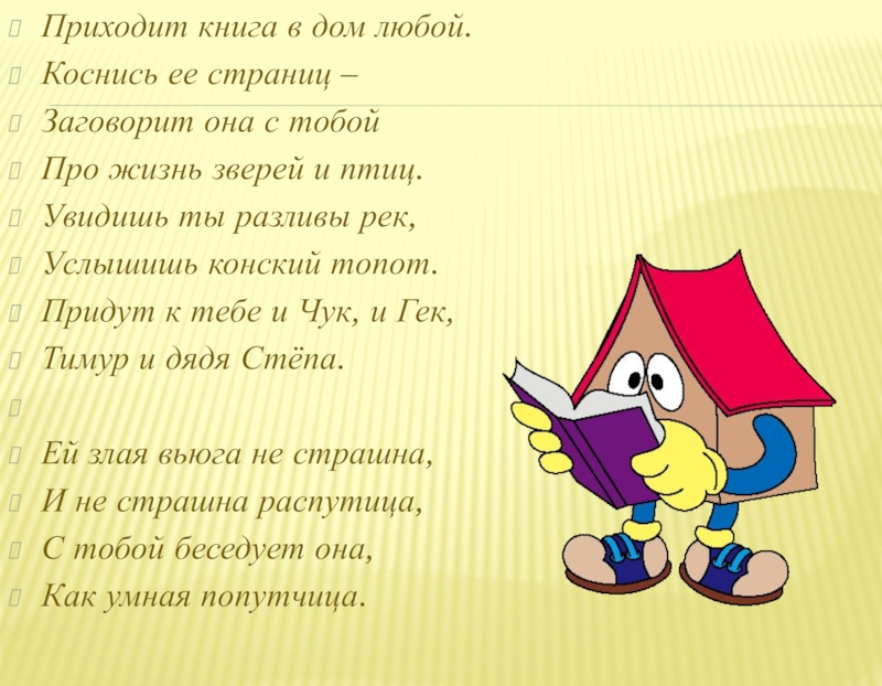 Приходит книга в дом любой.Коснись ее страниц – Заговорит она с тобойПро жизнь зверей и птиц.Увидишь ты