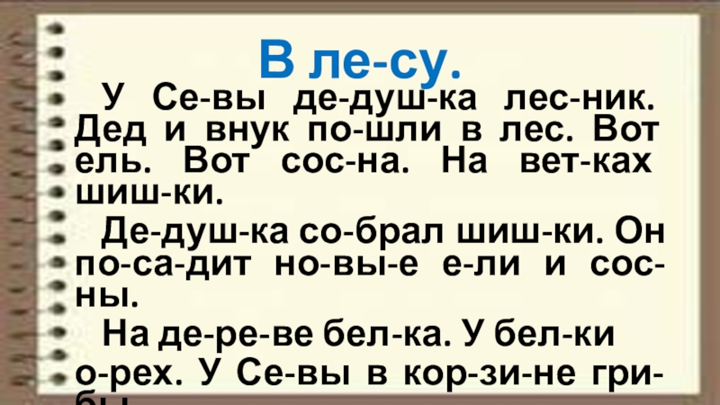 В ле-су.	У Се-вы де-душ-ка лес-ник. Дед и внук по-шли в лес. Вот ель. Вот сос-на. На вет-ках