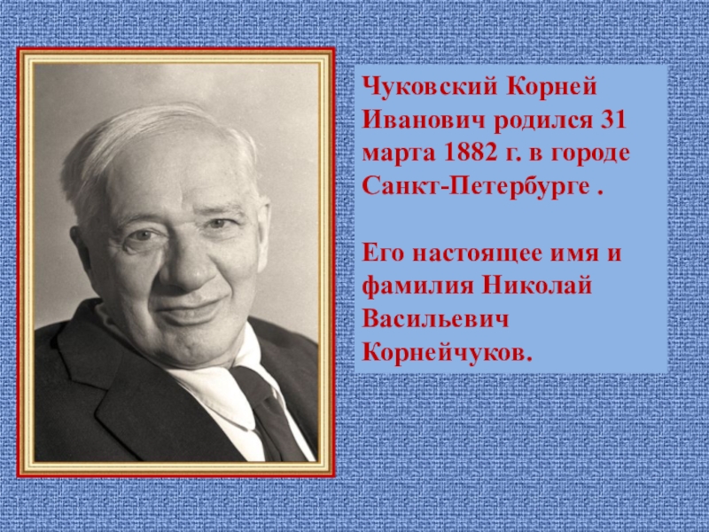 Чуковский Корней Иванович родился 31 марта 1882 г. в городе Санкт-Петербурге .Его настоящее имя и фамилия Николай