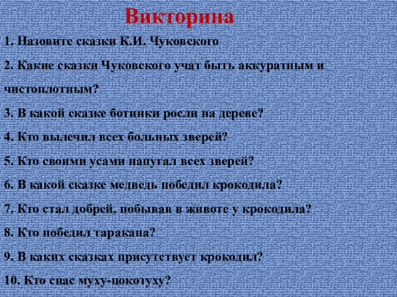 Викторина1. Назовите сказки К.И. Чуковского2. Какие сказки Чуковского учат быть аккуратным и чистоплотным?3. В какой сказке ботинки