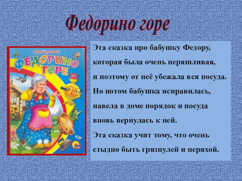 Федорино гореЭта сказка про бабушку Федору, которая была очень неряшливая,и поэтому от неё убежала вся посуда.Но потом