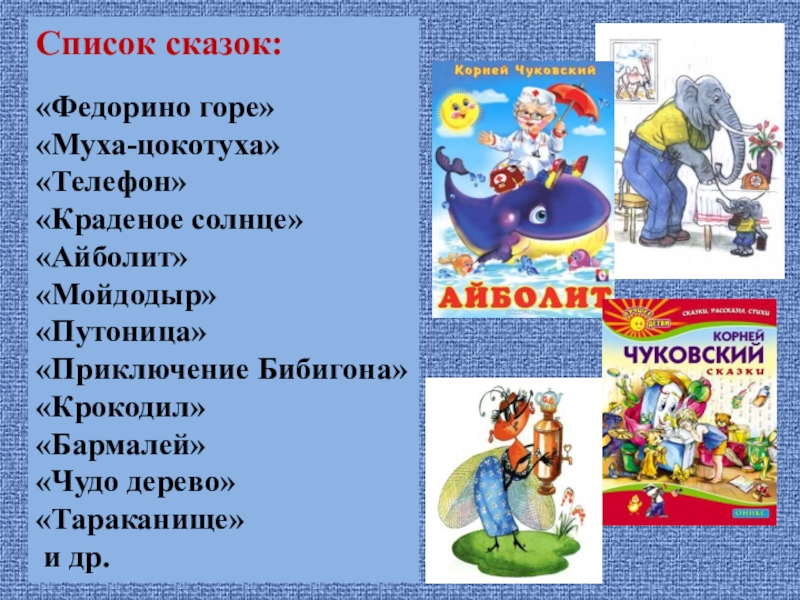 Список сказок:«Федорино горе»«Муха-цокотуха»«Телефон»«Краденое солнце»«Айболит»«Мойдодыр»«Путоница»«Приключение Бибигона»«Крокодил»«Бармалей»«Чудо дерево»«Тараканище» и др.