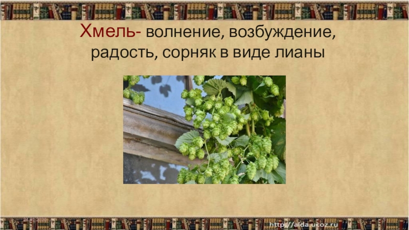 Слайд 5Хмель- волнение, возбуждение, радость, сорняк в виде лианы