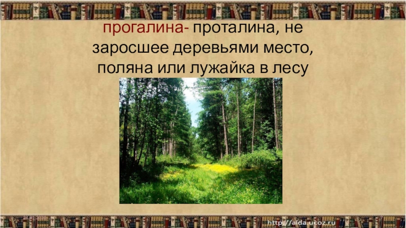 Слайд 7прогалина- проталина, не заросшее деревьями место, поляна или лужайка в лесу