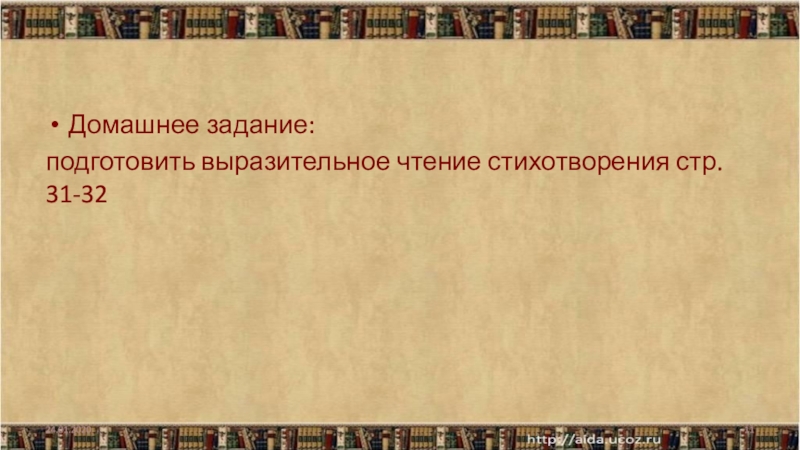Домашнее задание:подготовить выразительное чтение стихотворения стр. 31-32