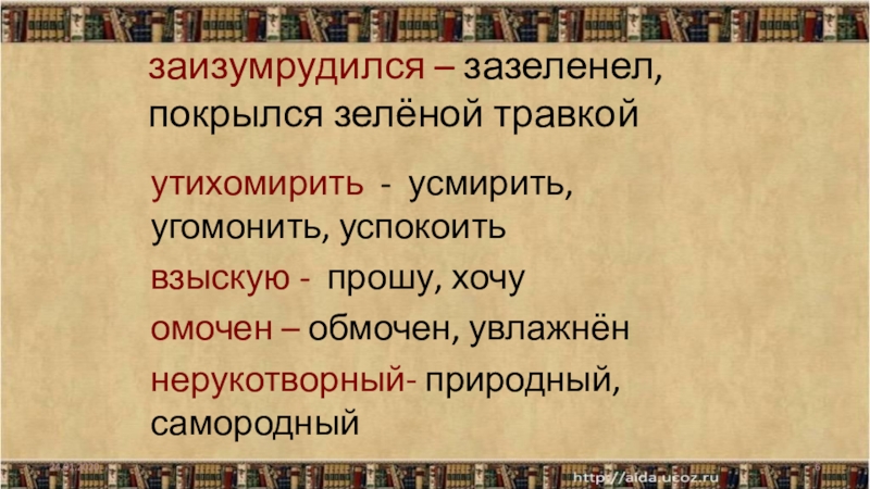 заизумрудился – зазеленел, покрылся зелёной травкойутихомирить - усмирить,       угомонить, успокоитьвзыскую -