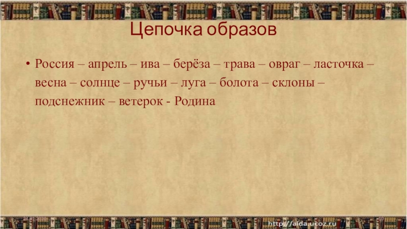 Цепочка образовРоссия – апрель – ива – берёза – трава – овраг – ласточка – весна –