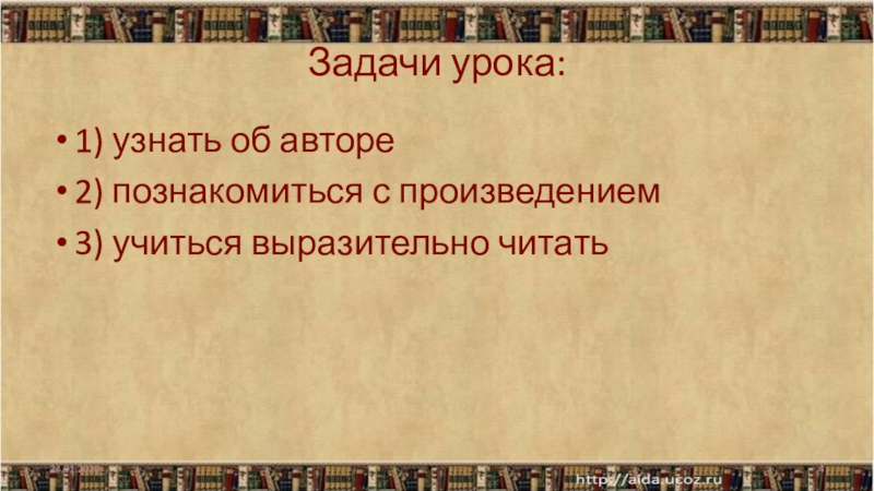 Задачи урока:1) узнать об авторе2) познакомиться с произведением3) учиться выразительно читать
