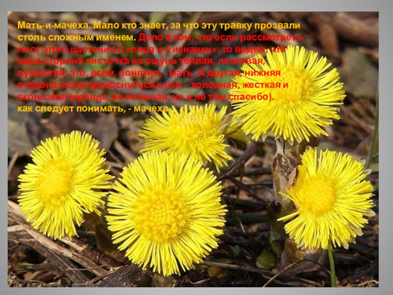 Слайд 5Мать-и-мачеха. Мало кто знает, за что эту травку прозвали столь сложным