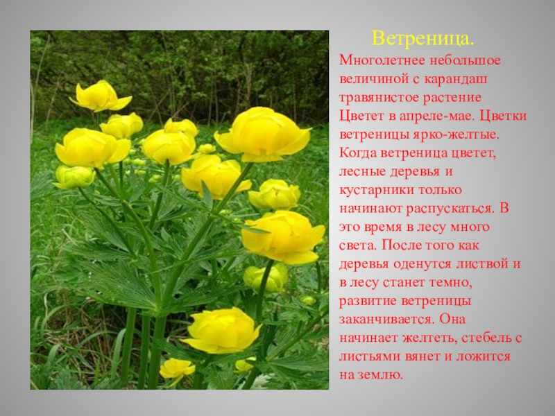 в апреле-мае. Цветки ветреницы ярко-желтые. Когда ветреница цветет, лесные деревья и кустарники только начинают распускаться. В это время в лесу много света. После того как деревья оденутся листвой и в лесу станет темно, развитие ветреницы заканчивается. Она начинает желтеть, стебель с листьями вянет и ложится на землю.