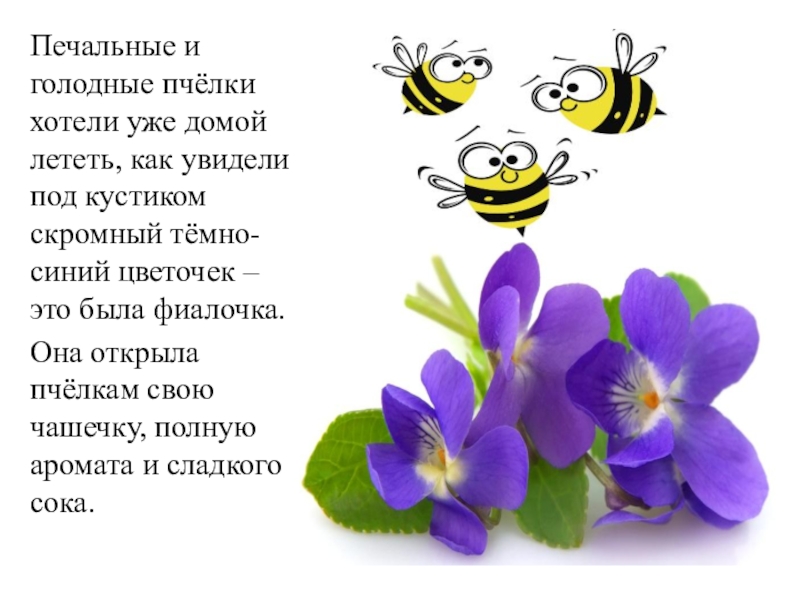 Печальные и голодные пчёлки хотели уже домой лететь, как увидели под кустиком скромный тёмно-синий цветочек – это