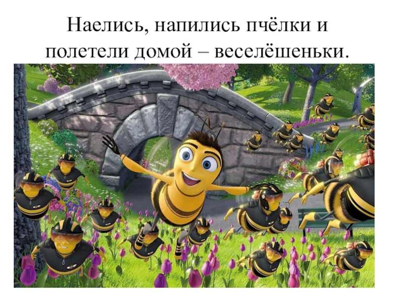 Слайд 9 Наелись, напились пчёлки и полетели домой – веселёшеньки.
