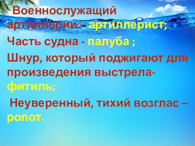 Строение для купанья- купальня;  Военнослужащий артиллерии – артиллерист;Часть судна - палуба ;Шнур, который поджигают для произведения выстрела- фитиль; Неуверенный, тихий