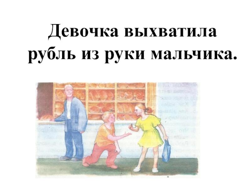 Слайд 11Девочка выхватила рубль из руки мальчика.