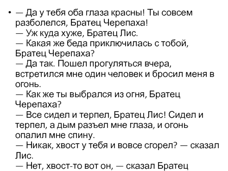 — Что-то вид у тебя нездоровый, Братец Черепаха, — говорит Лис.