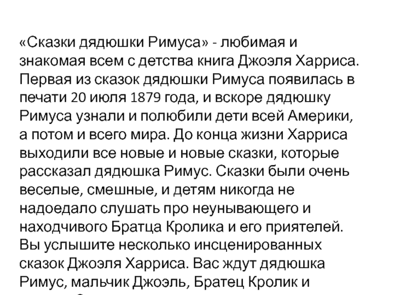 Слайд 6«Сказки дядюшки Римуса» - любимая и знакомая всем с детства книга