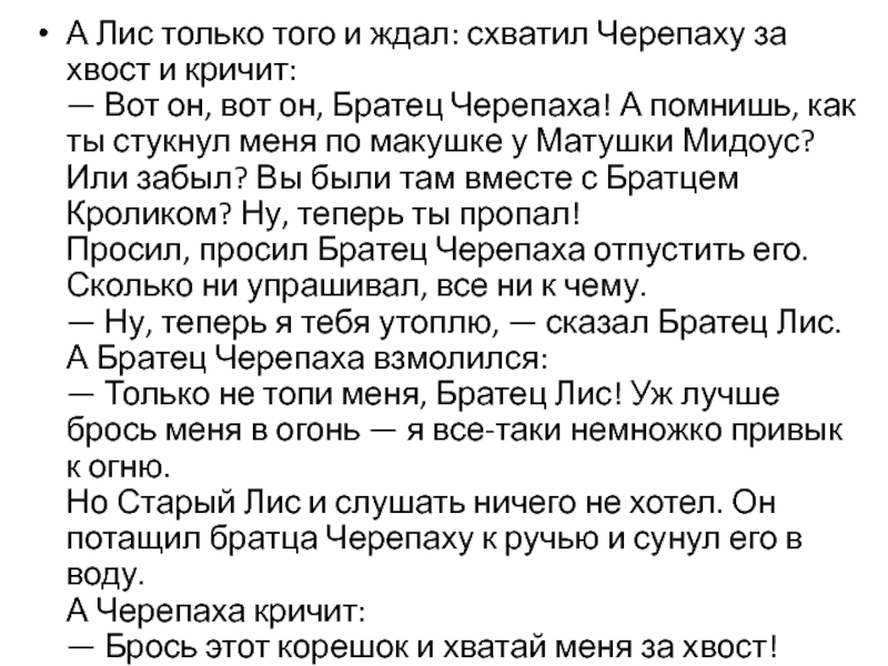 Слайд 11А Лис только того и ждал: схватил Черепаху за хвост и