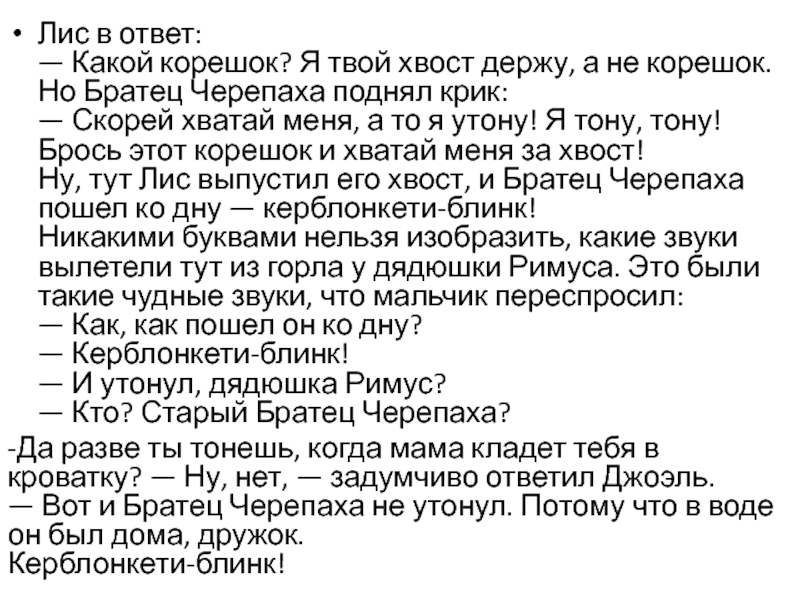 Ну, тут Лис выпустил его хвост, и Братец Черепаха пошел ко дну — керблонкети-блинк!