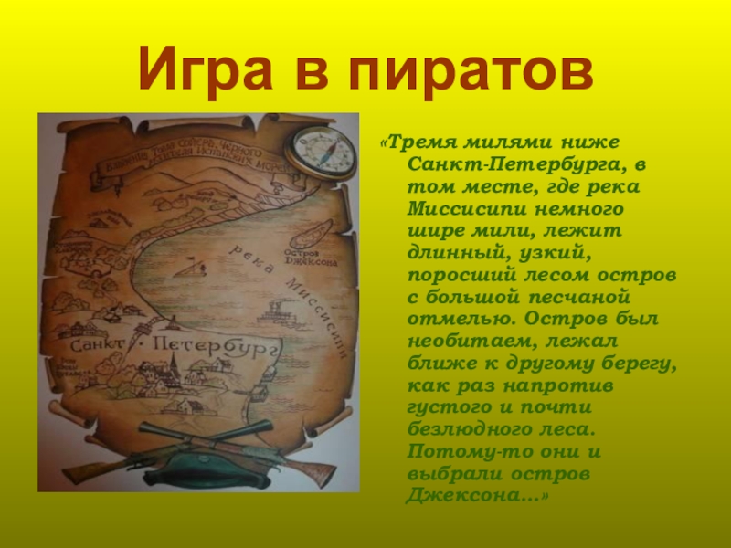 река Миссисипи немного шире мили, лежит длинный, узкий, поросший лесом остров с большой песчаной отмелью. Остров был необитаем, лежал ближе к другому берегу, как раз напротив густого и почти безлюдного леса. Потому-то они и выбрали остров Джексона…»