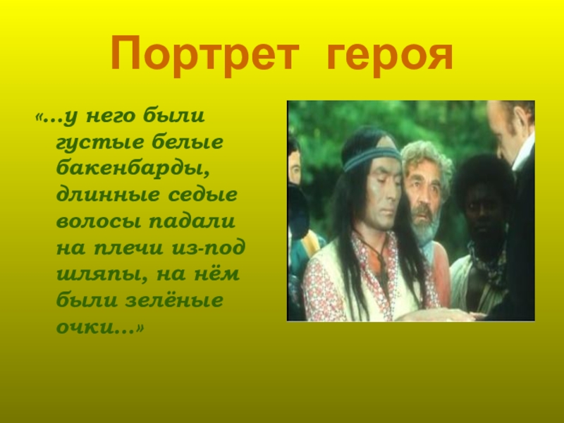 на плечи из-под шляпы, на нём были зелёные очки…»