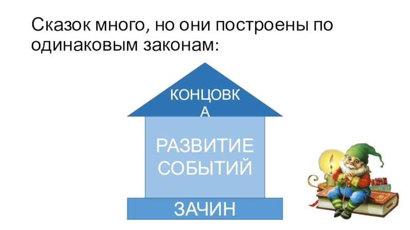 Сказок много, но они построены по одинаковым законам:ЗАЧИНРАЗВИТИЕ СОБЫТИЙКОНЦОВКА