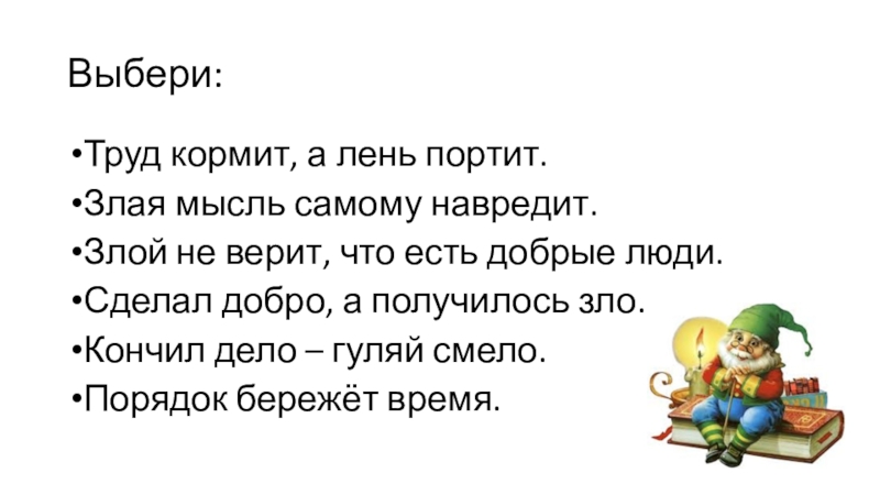 Выбери:Труд кормит, а лень портит.Злая мысль самому навредит.Злой не верит, что есть добрые люди.Сделал добро, а получилось