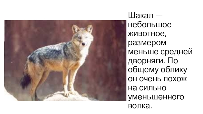 Слайд 5Шакал — небольшое животное, размером меньше средней дворняги. По общему облику