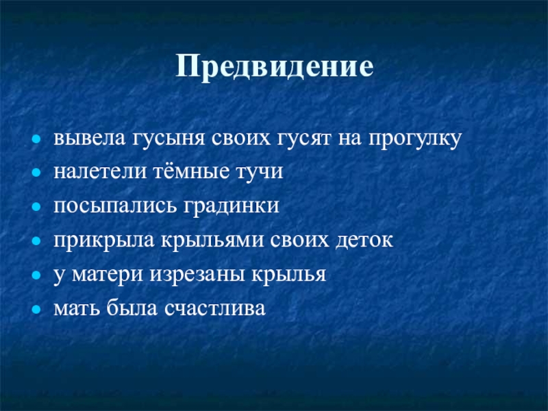 Предвидениевывела гусыня своих гусят на прогулкуналетели тёмные тучипосыпались градинкиприкрыла крыльями своих детоку матери изрезаны крыльямать была счастлива