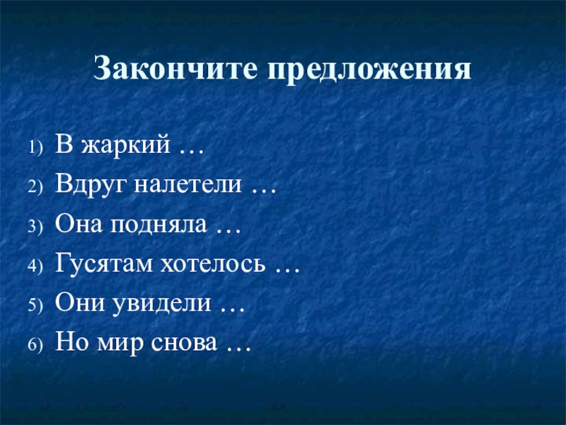 Закончите предложенияВ жаркий …Вдруг налетели …Она подняла …Гусятам хотелось …Они увидели …Но мир снова …