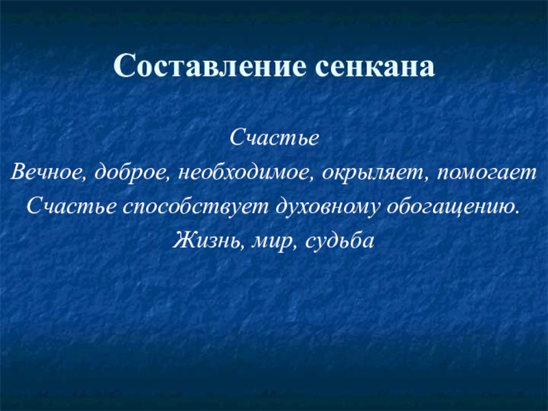 Составление сенканаСчастьеВечное, доброе, необходимое, окрыляет, помогаетСчастье способствует духовному обогащению.Жизнь, мир, судьба