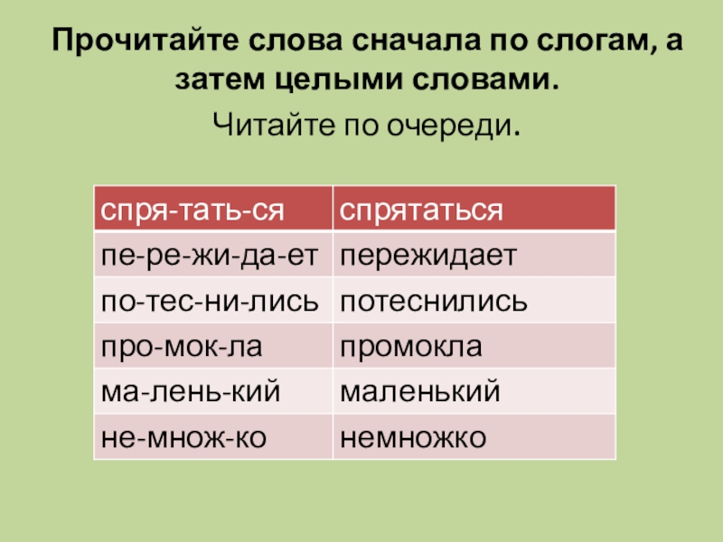 Слайд 7Прочитайте слова сначала по слогам, а затем целыми словами. Читайте по очереди.