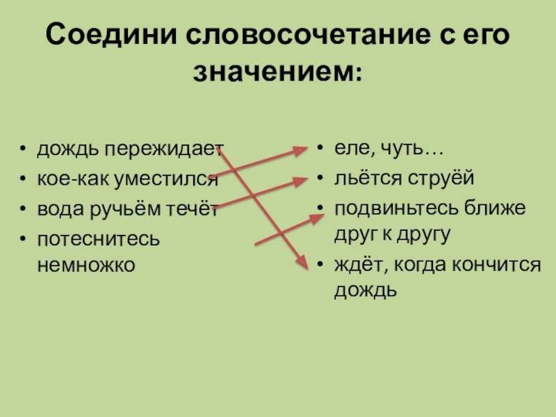 Соедини словосочетание с его значением:дождь пережидаеткое-как уместилсявода ручьём течётпотеснитесь немножкоеле, чуть…льётся струёйподвиньтесь ближе друг к другуждёт, когда