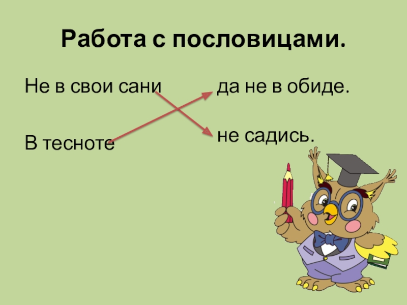 Работа с пословицами.Не в свои саниВ теснотеда не в обиде.  не садись.
