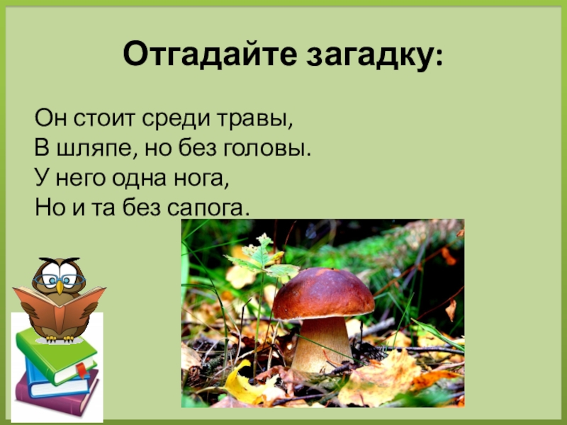 Отгадайте загадку:Он стоит среди травы,  В шляпе, но без головы. У него одна нога, Но и