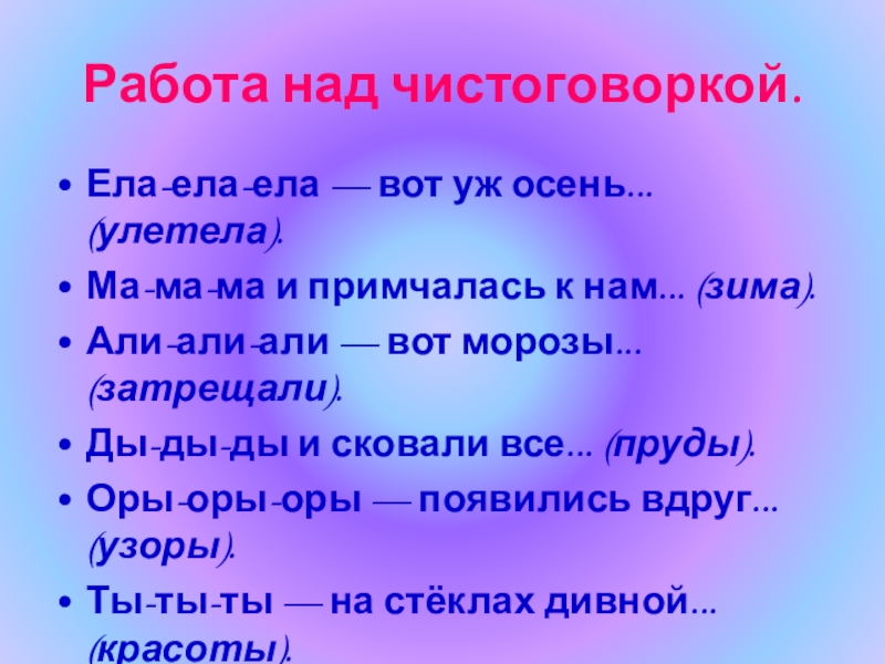 Работа над чистоговоркой.Ела-ела-ела — вот уж осень... (улетела).Ма-ма-ма и примчалась к нам... (зима).Али-али-али — вот морозы... (затрещали).Ды-ды-ды