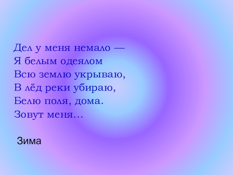 Дел у меня немало — Я белым одеяломВсю землю укрываю,В лёд реки убираю,Белю поля, дома.Зовут меня…