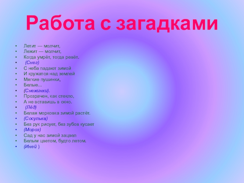 Работа с загадкамиЛетит — молчит, Лежит — молчит,Когда умрёт, тогда ревёт. (Снег)С неба падают зимойИ кружатся над