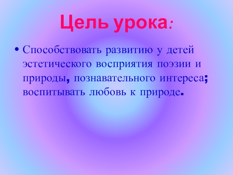 Цель урока:Способствовать развитию у детей эстетического восприятия поэзии и природы, познавательного интереса; воспитывать любовь к природе.