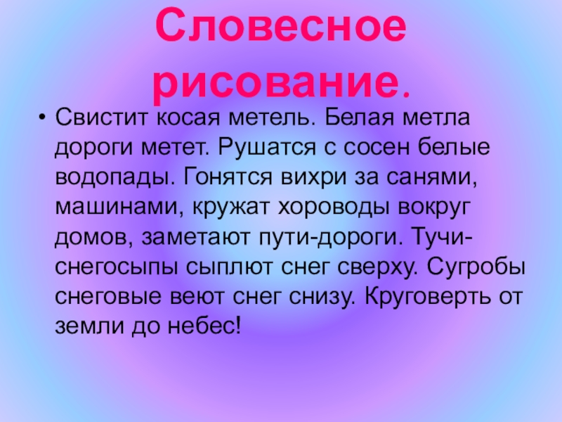 Словесное рисование.Свистит косая метель. Белая метла дороги метет. Рушатся с сосен белые водопады. Гонятся вихри за санями,