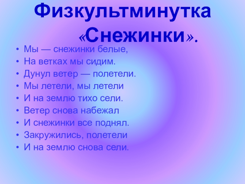 Физкультминутка «Снежинки».Мы — снежинки белые,На ветках мы сидим.Дунул ветер — полетели.Мы летели, мы летелиИ на землю тихо