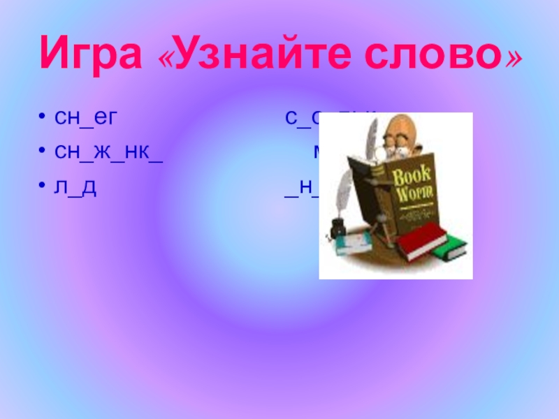 Игра «Узнайте слово»сн_ег							с_с_льк_сн_ж_нк_						м_р_зл_д							_н_й