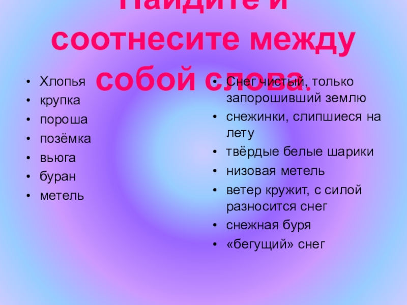 Найдите и соотнесите между собой слова.ХлопьякрупкапорошапозёмкавьюгабуранметельСнег чистый, только запорошивший землюснежинки, слипшиеся на летутвёрдые белые шарикинизовая метельветер кружит,